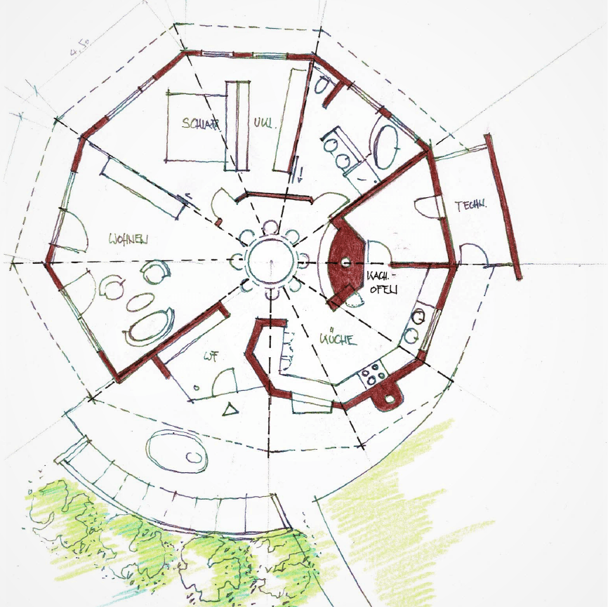 - Dachkonstruktion als freitragende "Mandala"- Konstruktion aus Holz